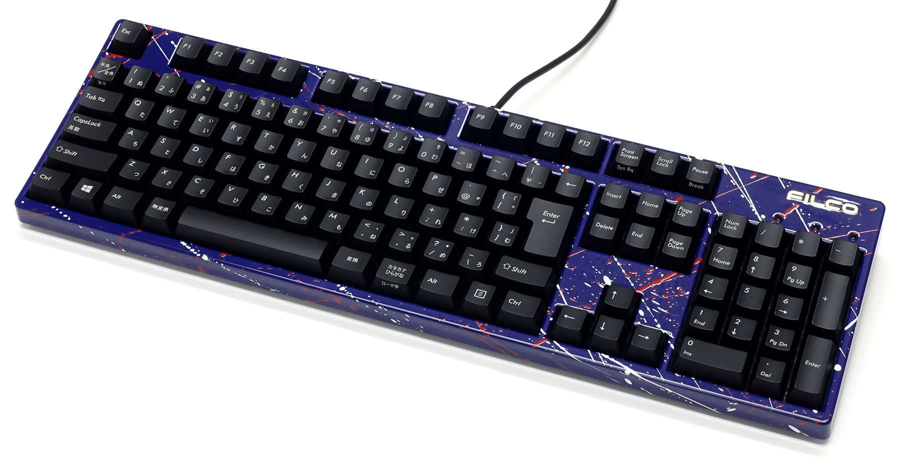 試作品の漆塗りフレームを装着した有線モデル・日本語かなありキーボードです。青い地の上から白と赤のしぶき塗りを施してあります。こちらも貴重な一点モノ。