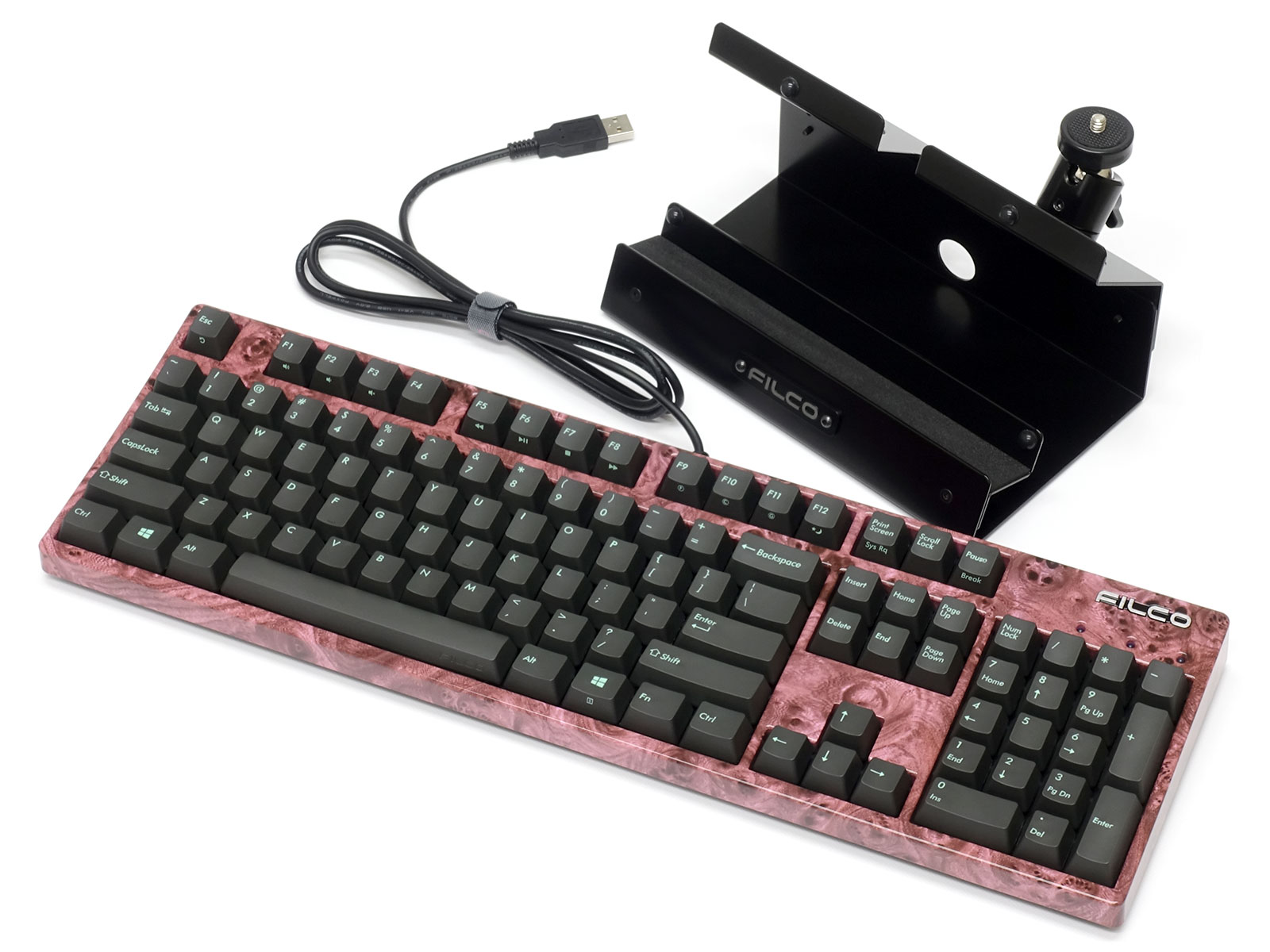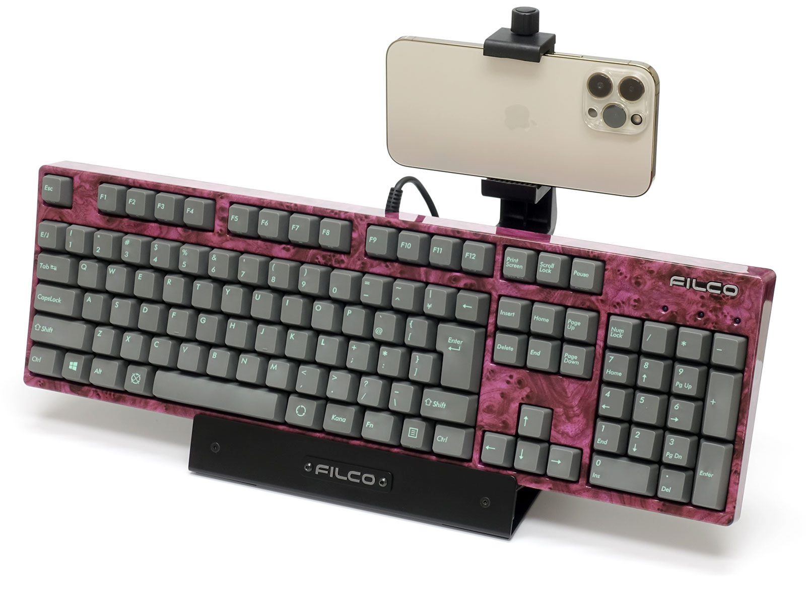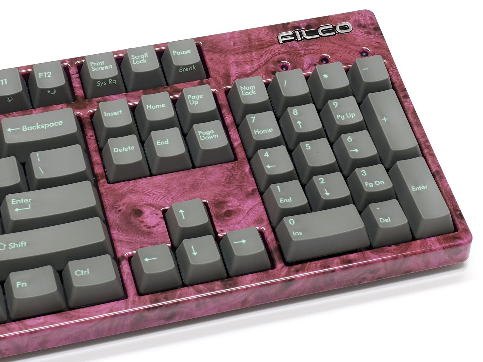 PBT2色成形キーキャップを採用。すべてのキーの本体色はアスファルトで、文字色がチェレステとなっています。