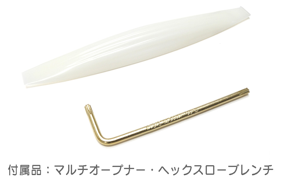 プラスチック製筐体を固定する爪を外すためのマルチオープナーとトルクスネジ専用ヘックスローブレンチをお付けしております。
