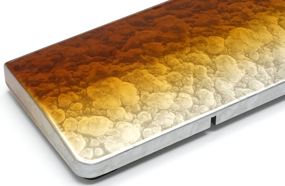「茜雲グラデーション」は、昼から夕暮れに変わる黄昏の瞬間をイメージしています。琥珀色の透漆をぼかし塗りし、夕焼けから黄金色への移ろいを表現しました。